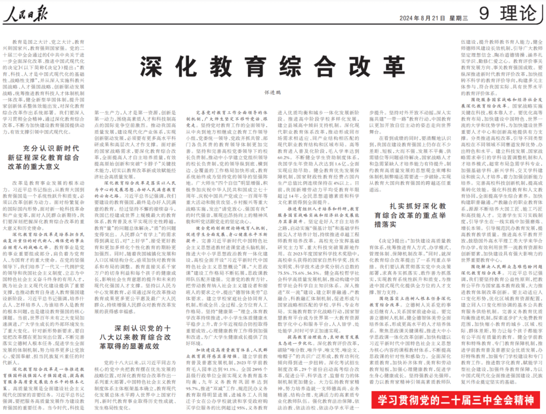 教育是國(guó)之大計(jì)、黨之大計(jì),教育興則國(guó)家興,教育強(qiáng)則國(guó)家強(qiáng)。黨的二十屆三中全會(huì)通過的《中共中央關(guān)于進(jìn)一步全面深化改革、推進(jìn)中國(guó)式現(xiàn)代化的決定》(以下簡(jiǎn)稱《決定》)提出:“教育、科技、人才是中國(guó)式現(xiàn)代化的基礎(chǔ)性、戰(zhàn)略性支撐”,并從深入實(shí)施科教興國(guó)戰(zhàn)略、人才強(qiáng)國(guó)戰(zhàn)略、創(chuàng)新驅(qū)動(dòng)發(fā)展戰(zhàn)略,統(tǒng)籌推進(jìn)教育科技人才體制機(jī)制一體改革,健全新型舉國(guó)體制,提升國(guó)家創(chuàng)新體系整體效能出發(fā),對(duì)深化教育綜合改革作出系統(tǒng)部署。我們要深入學(xué)習(xí)貫徹全會(huì)精神,通過深化教育綜合改革,不斷為加快建設(shè)教育強(qiáng)國(guó)提供動(dòng)力,有效支撐引領(lǐng)中國(guó)式現(xiàn)代化。